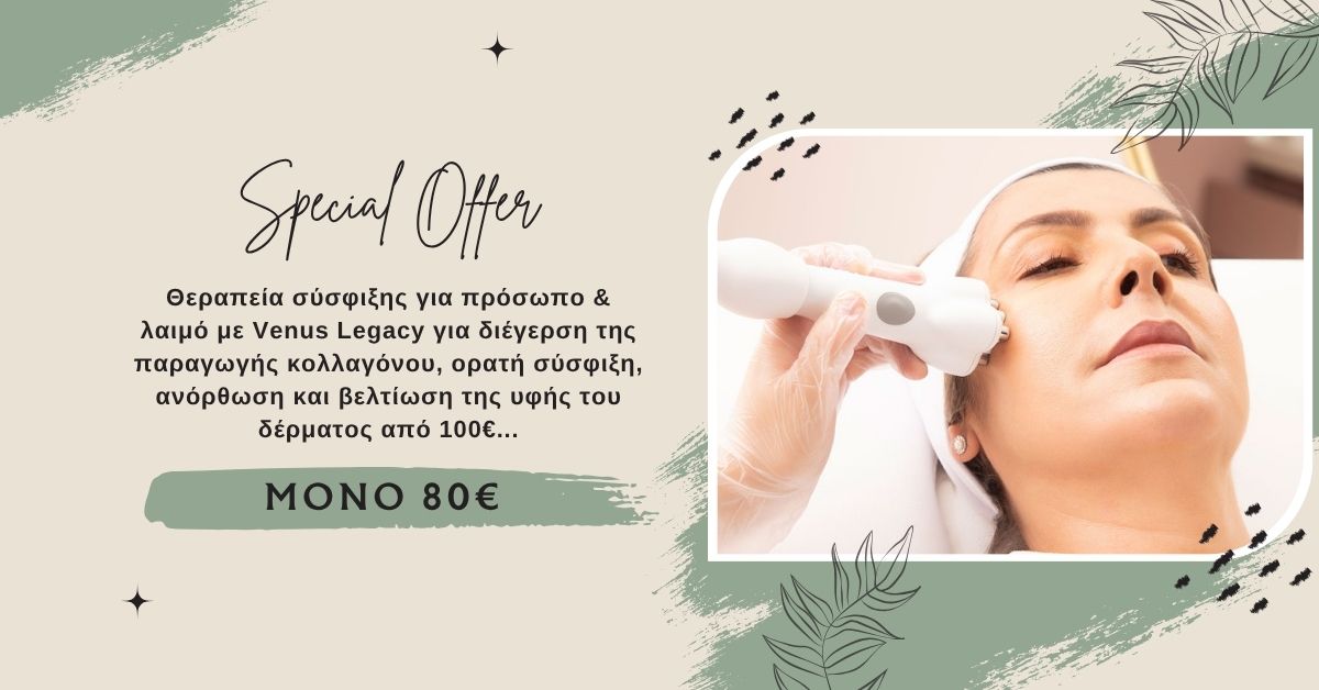 Η θεραπεία σύσφιξης με Venus Legacy για πρόσωπο και λαιμό χρησιμοποιεί πολυπολική ραδιοσυχνότητα και παλμικά μαγνητικά πεδία για να διεγείρει την παραγωγή κολλαγόνου, προσφέροντας ορατή σύσφιξη, ανόρθωση και βελτίωση της υφής του δέρματος χωρίς πόνο ή χρόνο αποθεραπείας.